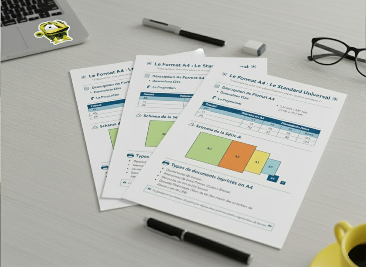 Le format A4 correspond à une feuille de 21 x 29,7 cm. C’est le format standard utilisé pour les documents administratifs, scolaires et professionnels.